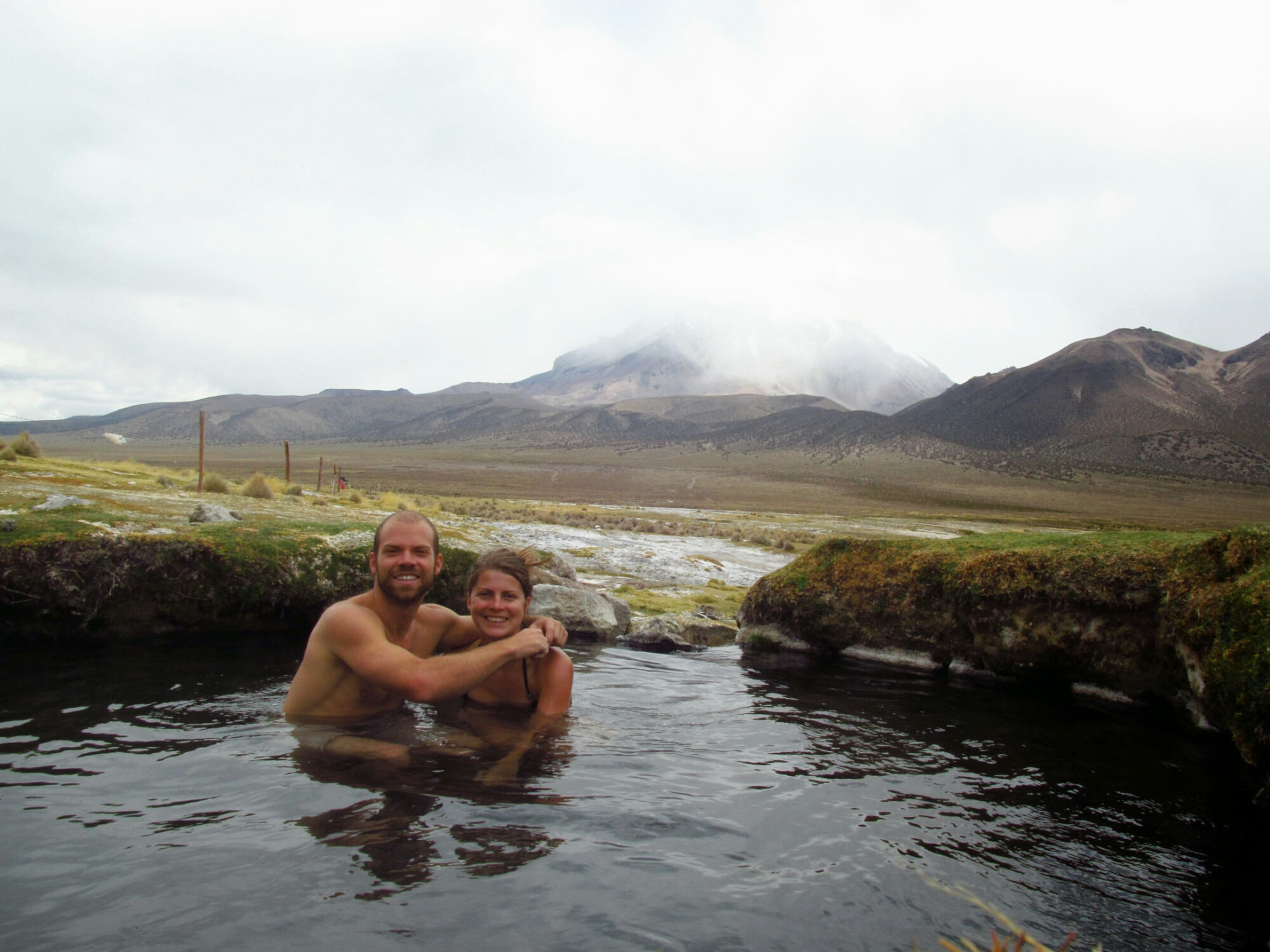 Notre destination, Sajama, est un petit village qui, lors de notre arrivée semblait inhabité, laissé à l’abandon. Néanmoins, il y avait l’électricité et de l’eau chaude dans les douches. D’ailleurs, nous en avons bien besoin, car la température était fraiche! Approximativement 5 ou 10 degrés les jours nuageux et ça gelait la nuit. Pas besoin de vous dire que les paysages étaient grandioses. À côté de ce volcan de 6000m recouvert par un glacier, on se sentait tout petit. Beaucoup de randonnées à faire dans ce coin de la Bolivie. Dû à leur map à l’échelle complètement inexacte, nous avons marché environ 30 km en une journée (aller-retour) pour se rendre à un lac au creux des montagnes. Je chialais tellement sur le chemin, mais maintenant, je suis plus que satisfaite d’y être allée. Sur le sentier, Geysers et animaux sauvages étaient au rendez-vous. Pour vous donner un exemple des paysages, je me sentais comme dans Heidi, entourée de montagnes! Le fameux lac finalement, était au Chili, vive les frontières ambiguës! Benjamin a le mérite de s’être baigné dans le plus haut lac de sa vie! 4800 mètres d’altitude! Selon son allure à la sortie, ça paraissait un poco frio!