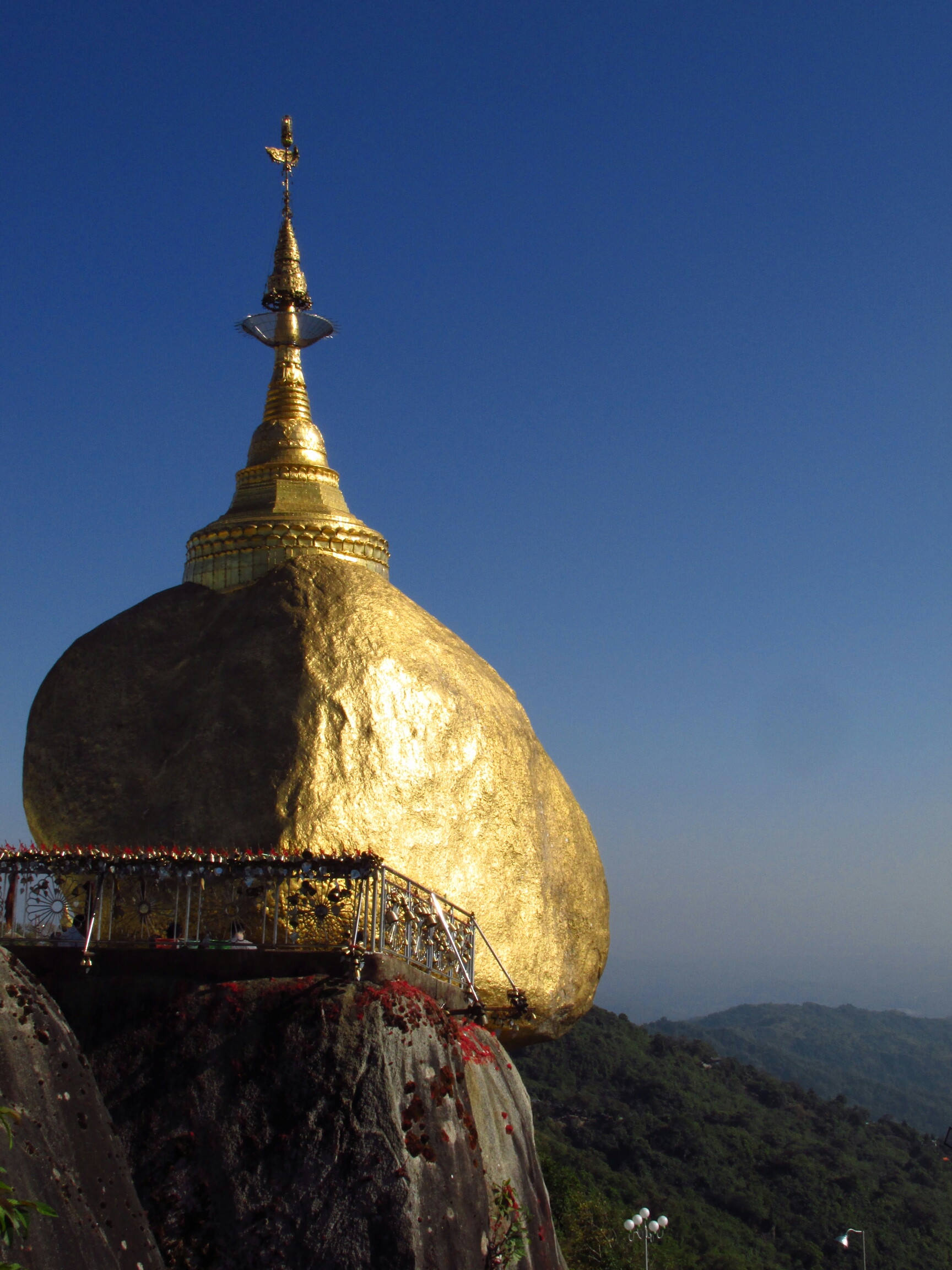 Sur le chemin, nous nous sommes arrêtés à la Golden Rock. Une roche sacrée, qui tient sur une falaise par, apparemment, un seul cheveu de Bouddha. Pour vous y rendre, vous pouvez gravir en 3 à 4 heures le sentier de pèlerinage ou vous entasser dans une boîte de camionnette géante avec une soixantaine d’autres voyageurs pour un trajet à vous rendre malade! Une fois sur place, les femmes, êtres impures que nous sommes, ne pouvons pas nous approcher ou toucher la roche. Vous apprendrez d’ailleurs lors d’un prochain billet que certaines coutumes sont très sexistes!