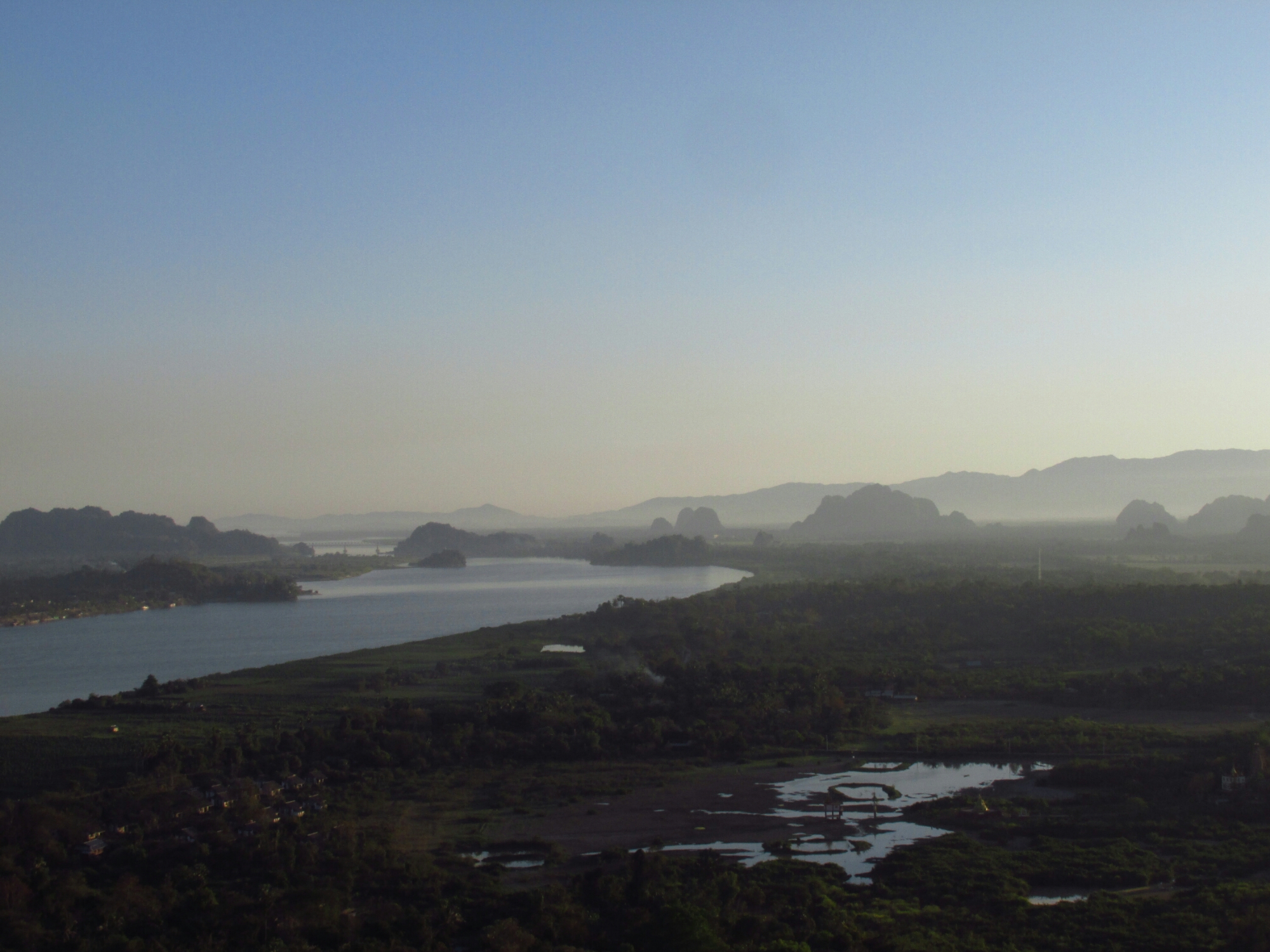 La ville de Hpa-an est, malheureusement, sans grand intérêt, mais à seulement quelques kilomètres, c’est magique! D’abord, le coucher de soleil vu du mont Hpan Pu était à couper le souffle! Surtout que nous devions traverser la rivière dans laquelle, à notre retour, se lavaient les habitants.