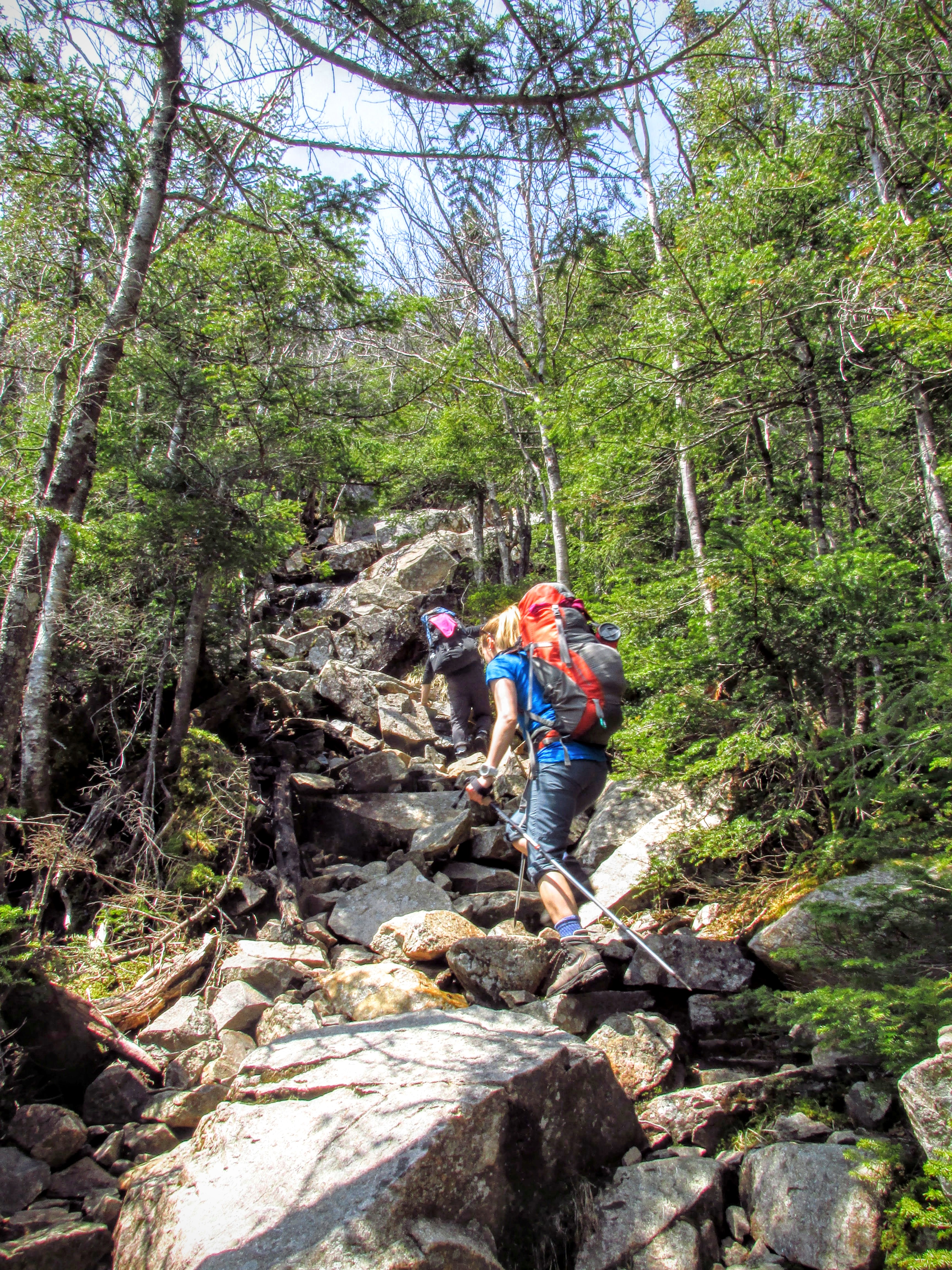 Approximativement 21.8 km aller-retour, nous avons préféré dormir là-haut plutôt que de marcher 10 heures dans la même journée. La Gale River loop nous a permis de nous rendre jusqu’à la Galehead Hut à près de 10 km du stationnement, un refuge à 38 personnes, très accommodant. En période estivale, les repas sont fournis ! La montée est assez calme et cette portion de la randonnée n’est pas bien difficile. Pourtant, déjà, la vue se fait belle et douce et les oiseaux colorés se posent à nos côtés, un moment de pure détente.